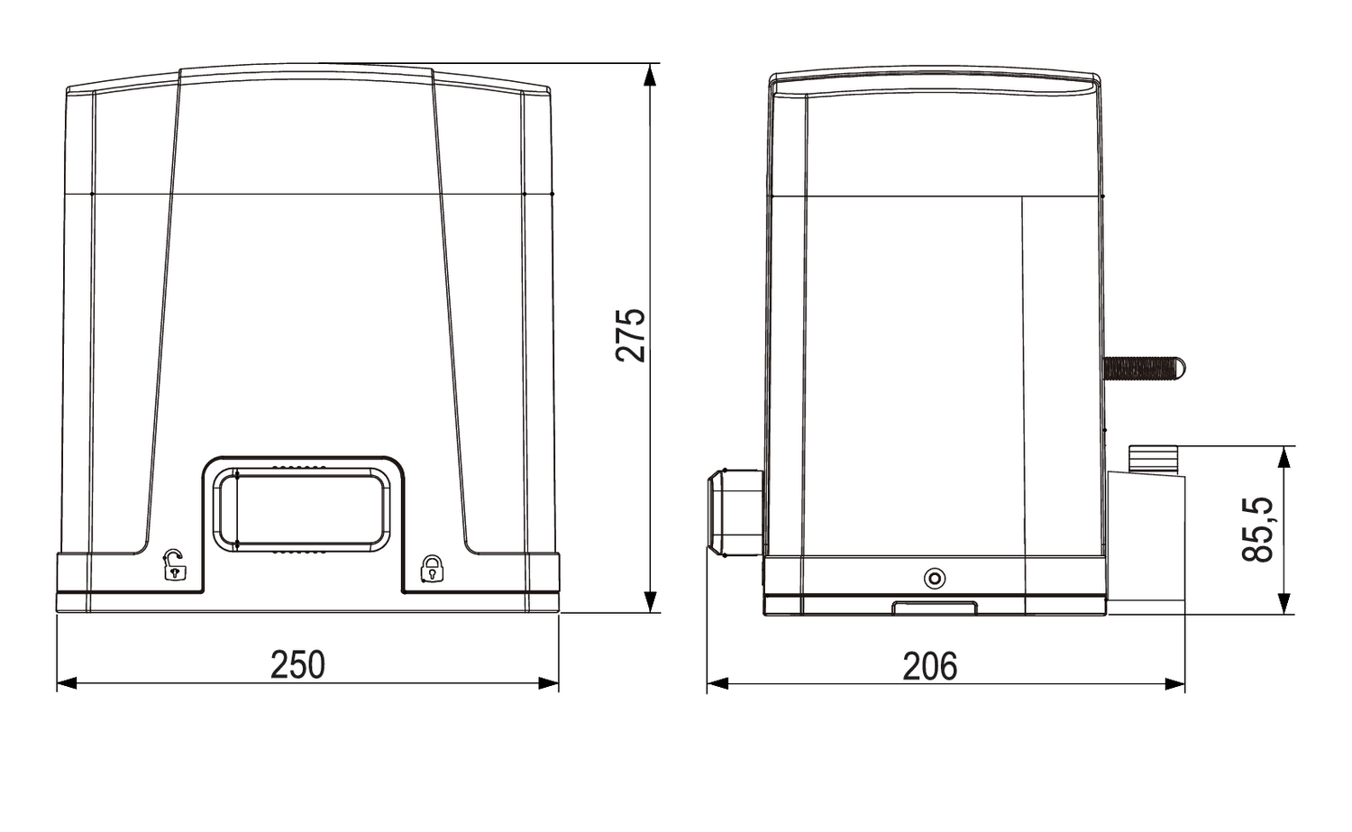 Mark: Rollkit, Module of the gear comb: mod 4, Recommended weight of the wing: 200kg, Frequency (MHz): 433, WIFI connection: Yes, Code type: Rolling, Drive slowdown: Drive decelerate before endpoint, Motor power supply: DC 24V, Performance: 110W, Force: 400N, Speed: 27,1 cm/s, Power supply: AC 230V, Controller: CUD-3S, Protection level: IP44