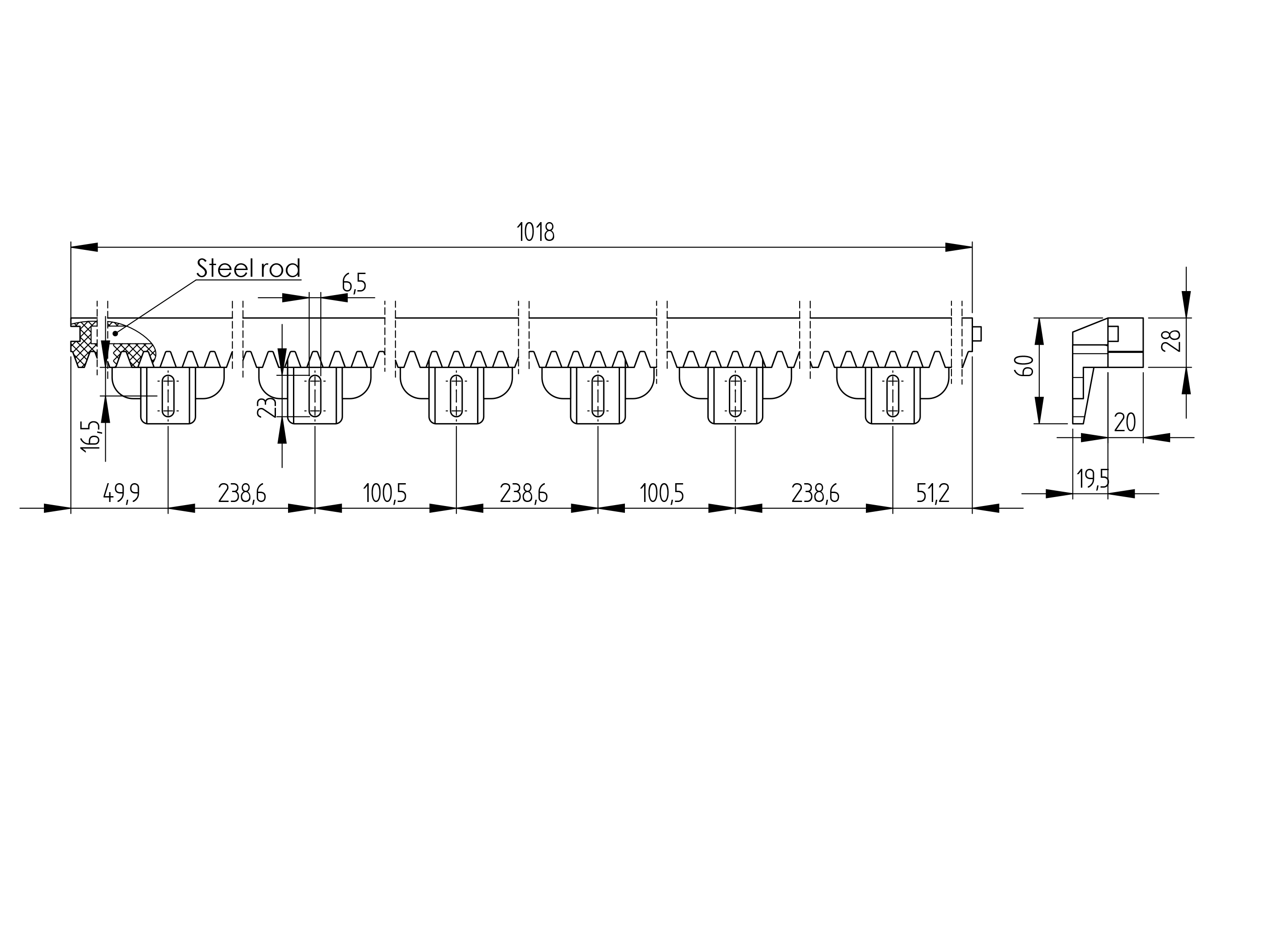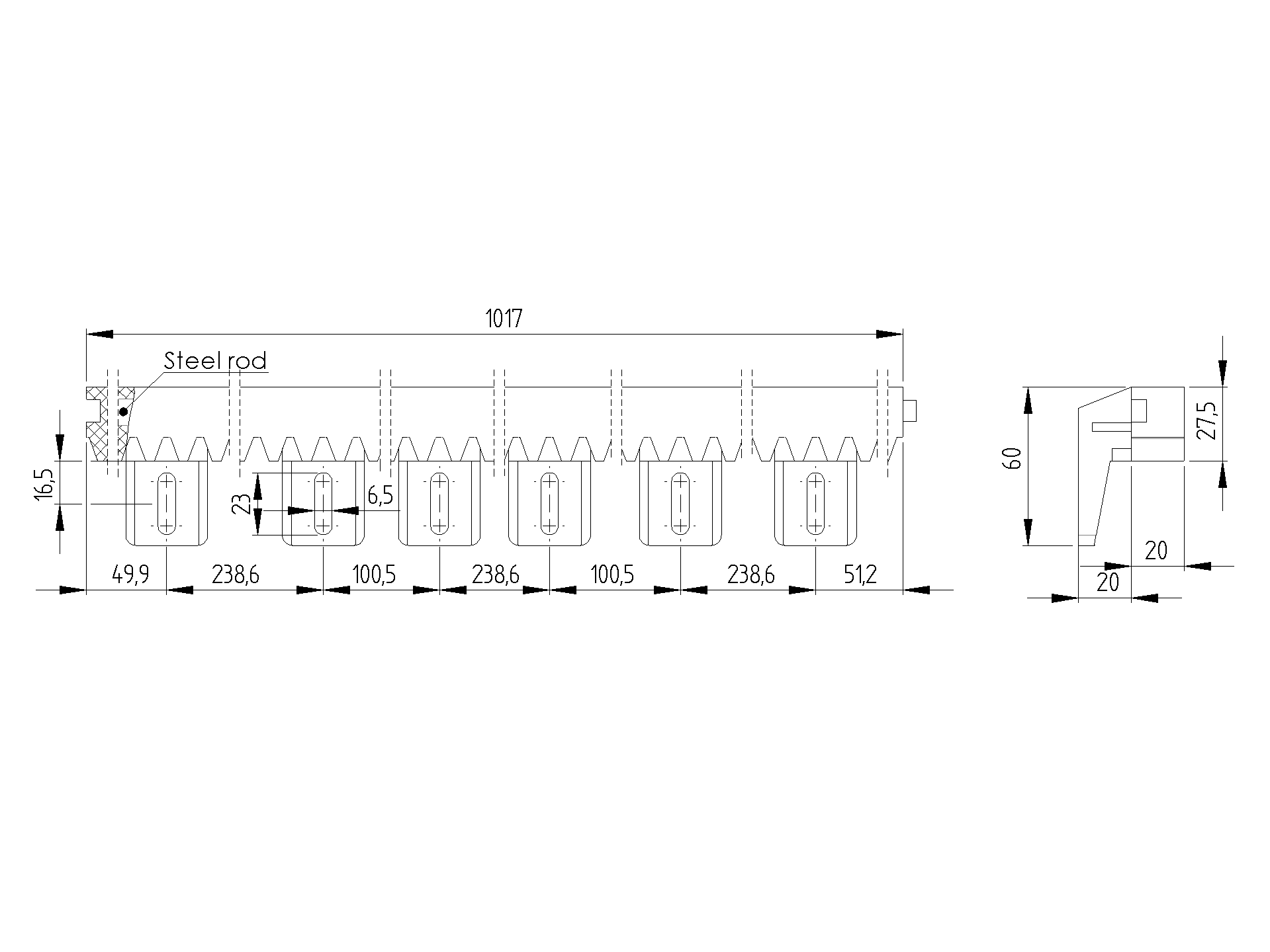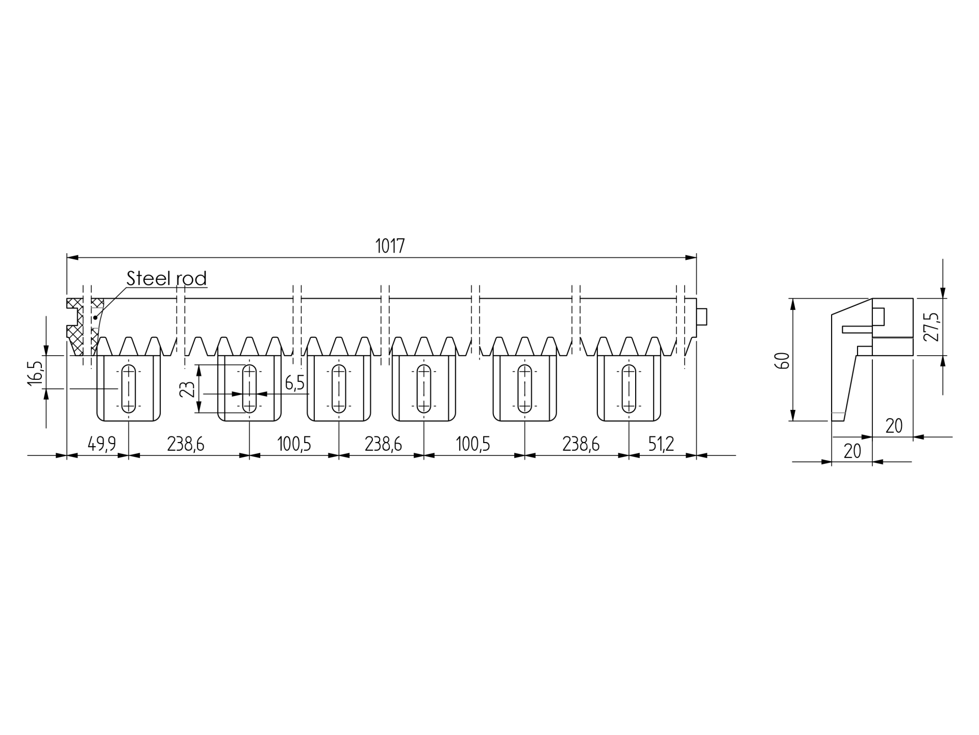 1 pcsMaterialSteelSurface finishGalvanizedTooth rack PVC+Fe,27x20mm,L1m,max 1200kg H/01PVC-S-BS