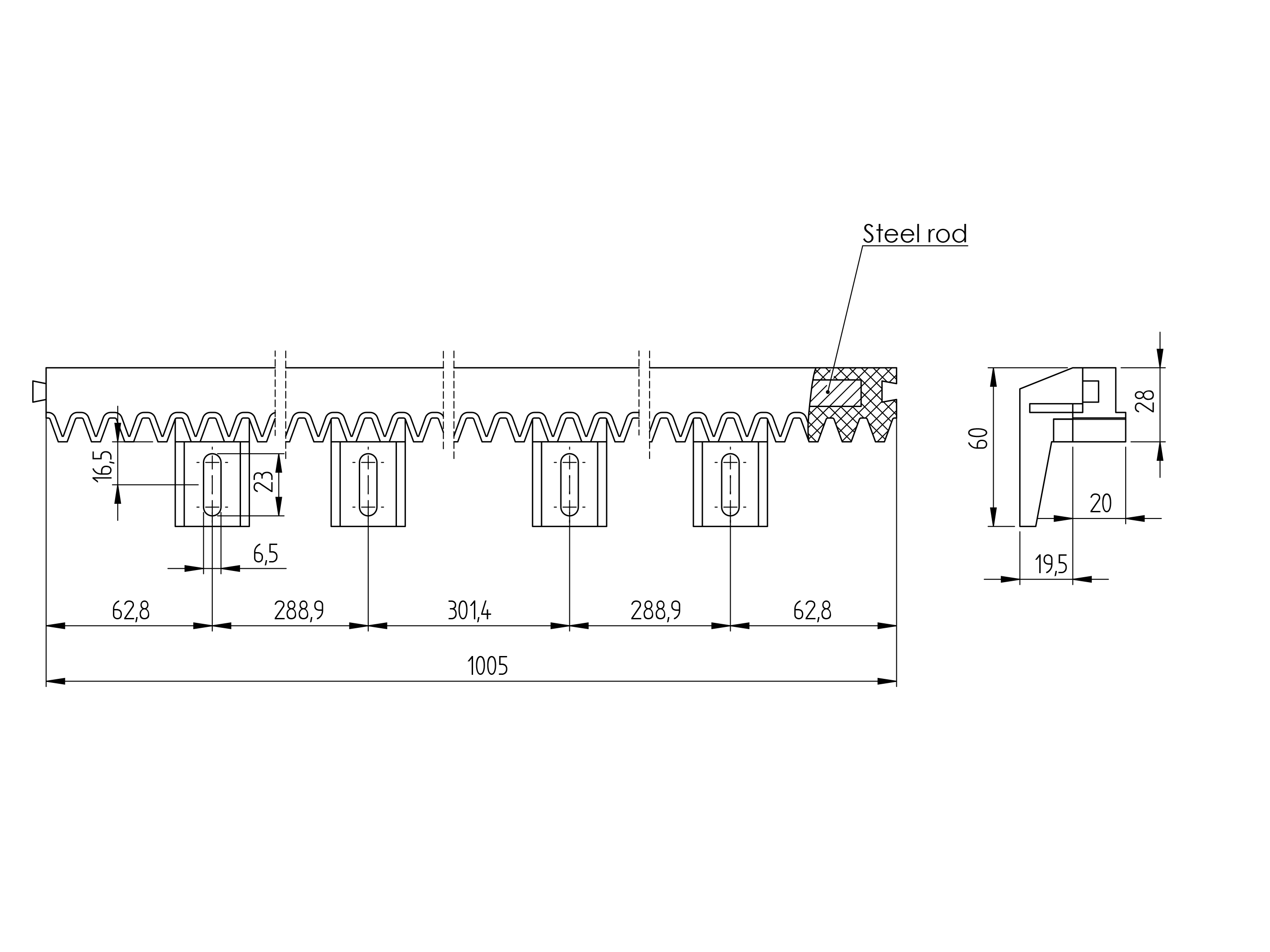 Lowest price in the last 30 days: €14,34 without VATIn stock (295 units)Nylon gear rack with steel core L1m,max 700kg H/01PVC-BS