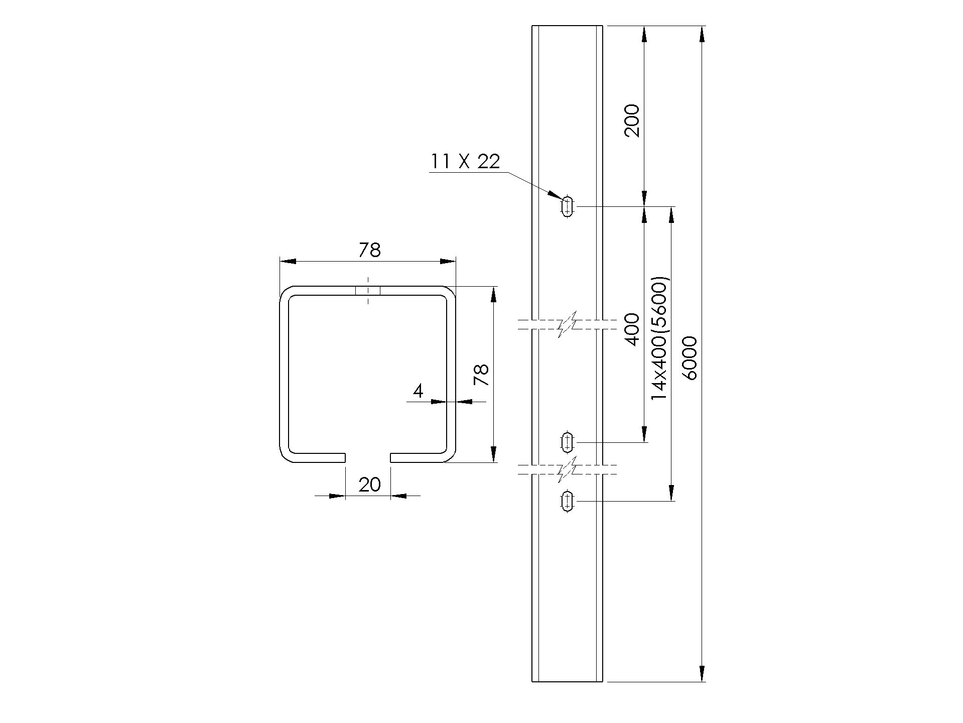 • Guide profile with holes Zn, 78x78x4mm, L6m H/02-80x80-Zn-D-6000