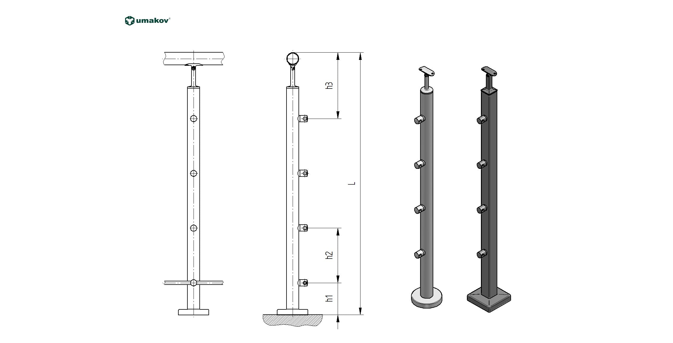 4 pcsMaterialStainless steel AISI 304Surface finishRawL12Inox pole, VK-stairs AISI304, 40x40x2/5xd12/H1000m CAJP-VS100-5D12