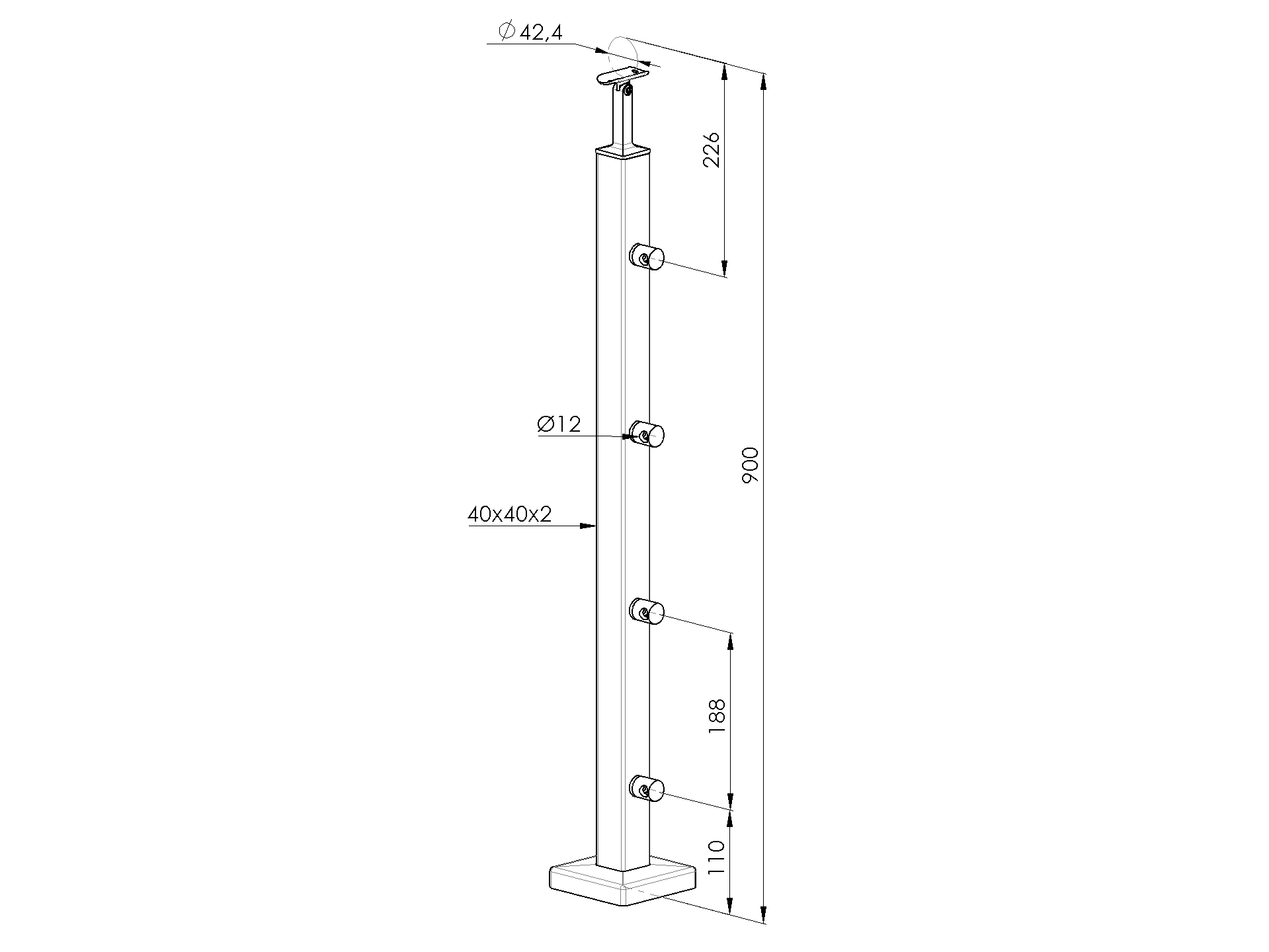 1 pcsMaterialStainless steel AISI 304Surface finishSatinedPost40x40x2Required productsOak pole 40x40mm, 4xd12mm, h=90cm, VK - straight WDJP-VR90-4D12