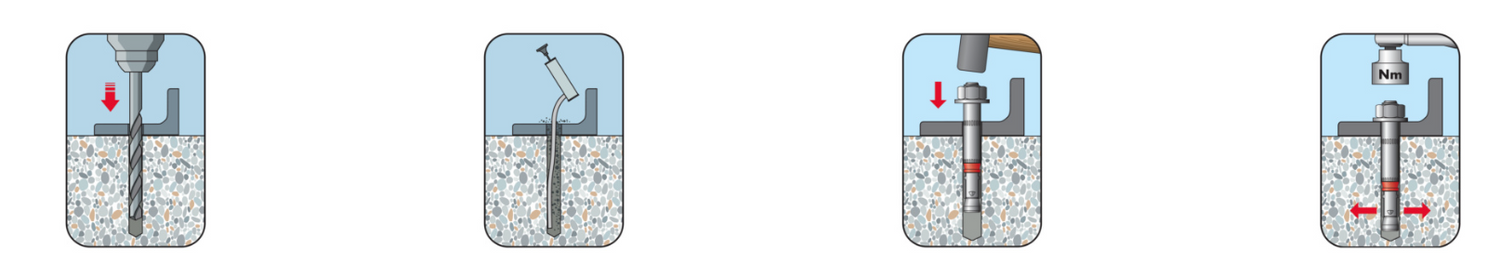 The anchor is suitable for fixing brackets, steel structures, cable routes, prefabs, sheds, bridge cranes, cranes, machine shops, structural metal structures, large galleries, cantilevered roofs, porches and everything cantilevered.