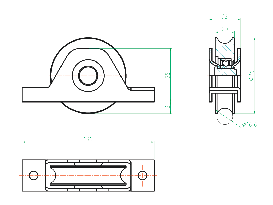Trolley capstan with holder for roller sliding gates, average 80mm, single bearing, designed for screwing to the door frame (flush mounting), for rails type "U", D16, hot galvanized.