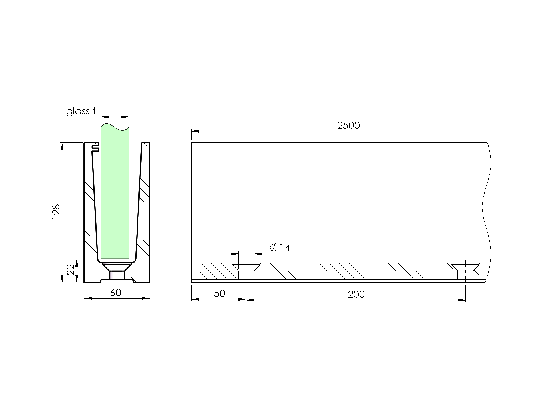 Side mount - glass drainage profile AL/0005-S-E-2500-Drain