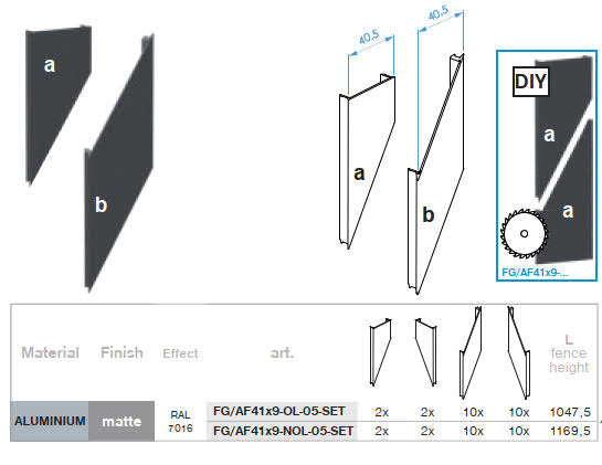 Kompletny zestaw skośnych dystansowych listew osłonowych dla systemu MOUNT L2. Z tym zestawem złożysz pole ogrodzeniowe o maksymalnej wysokości 1047,5 mm. Listwy są osadzone z 5 mm zakryciem, dzięki czemu pole ogrodzeniowe jest nieprzezroczyste.